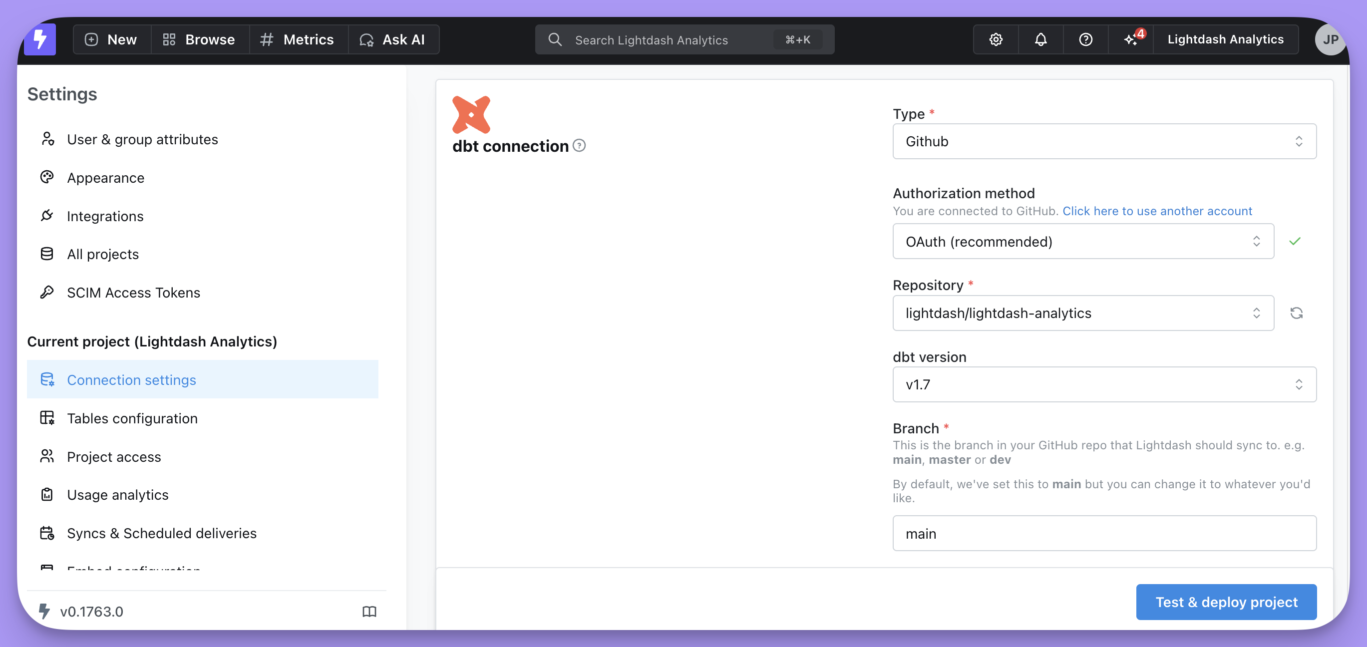 This is the branch in your GitHub repo that Lightdash should sync to. e.g.main, master or dev
