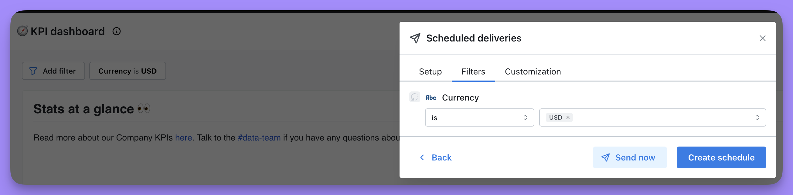 You can choose if you want to send your scheduled delivery to Slack, email, or both. You can add as many Slack channels and email addresses as you’d like to here. You can send a scheduled delivery to a person in Slack using@persons-name or to a channel using #channel-name.