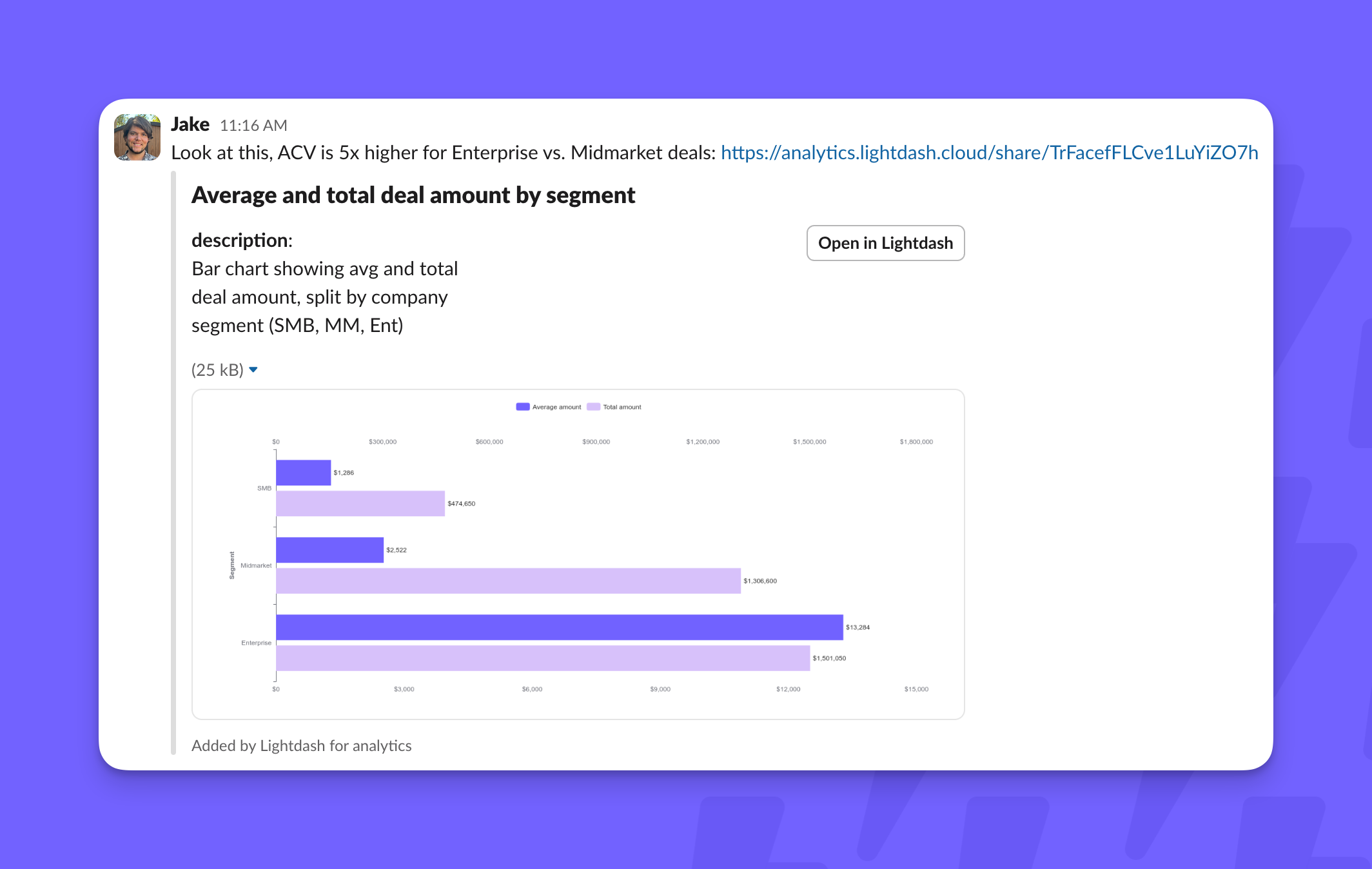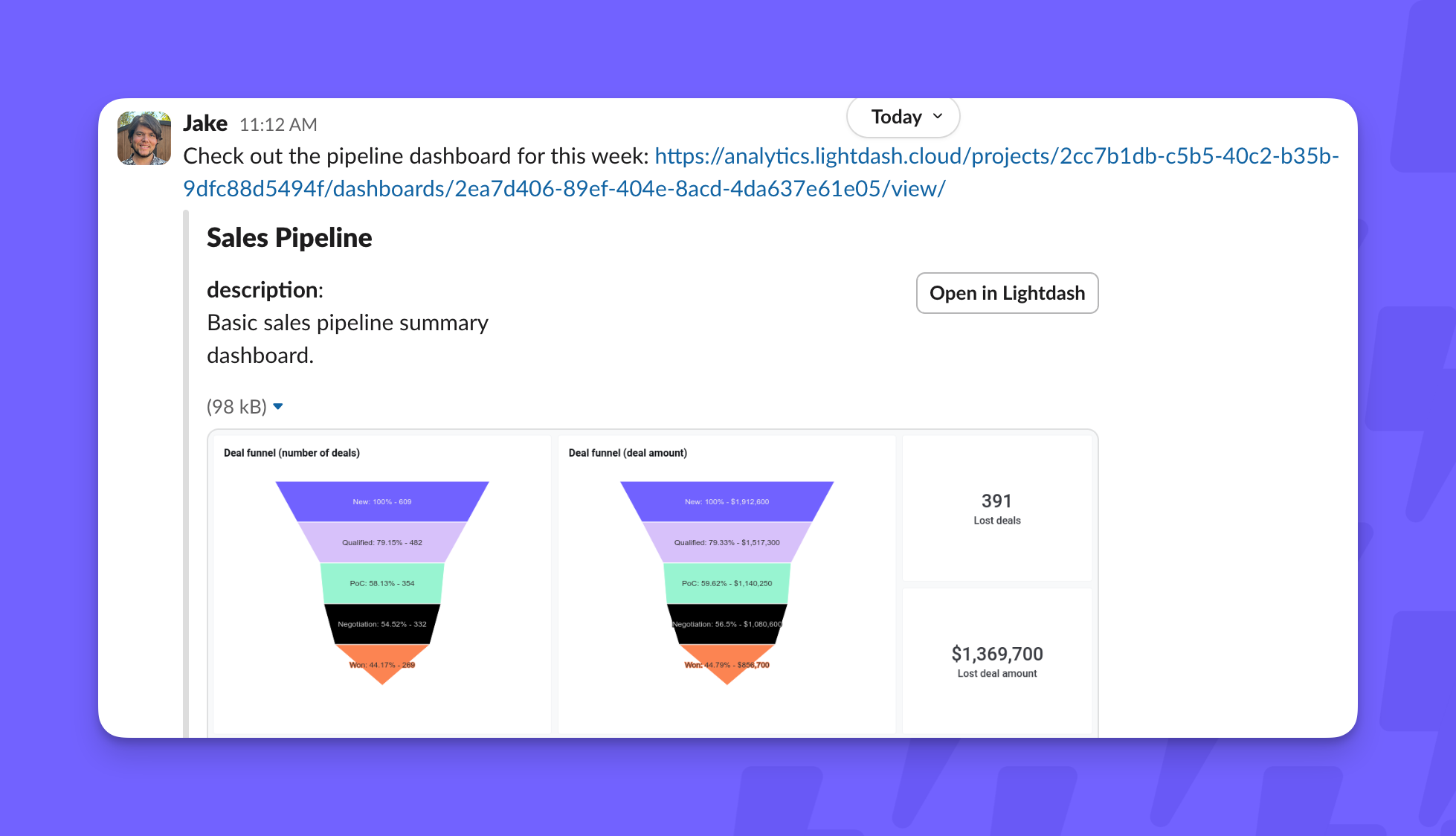 Once Slack is added to your Lightdash organization you can use it as a destination for scheduled deliveries. You can schedule refreshes for either Charts or Dashboards and push the results into a Slack channel or DM. The result will look like this for charts if you choose to attach an image of the chart: