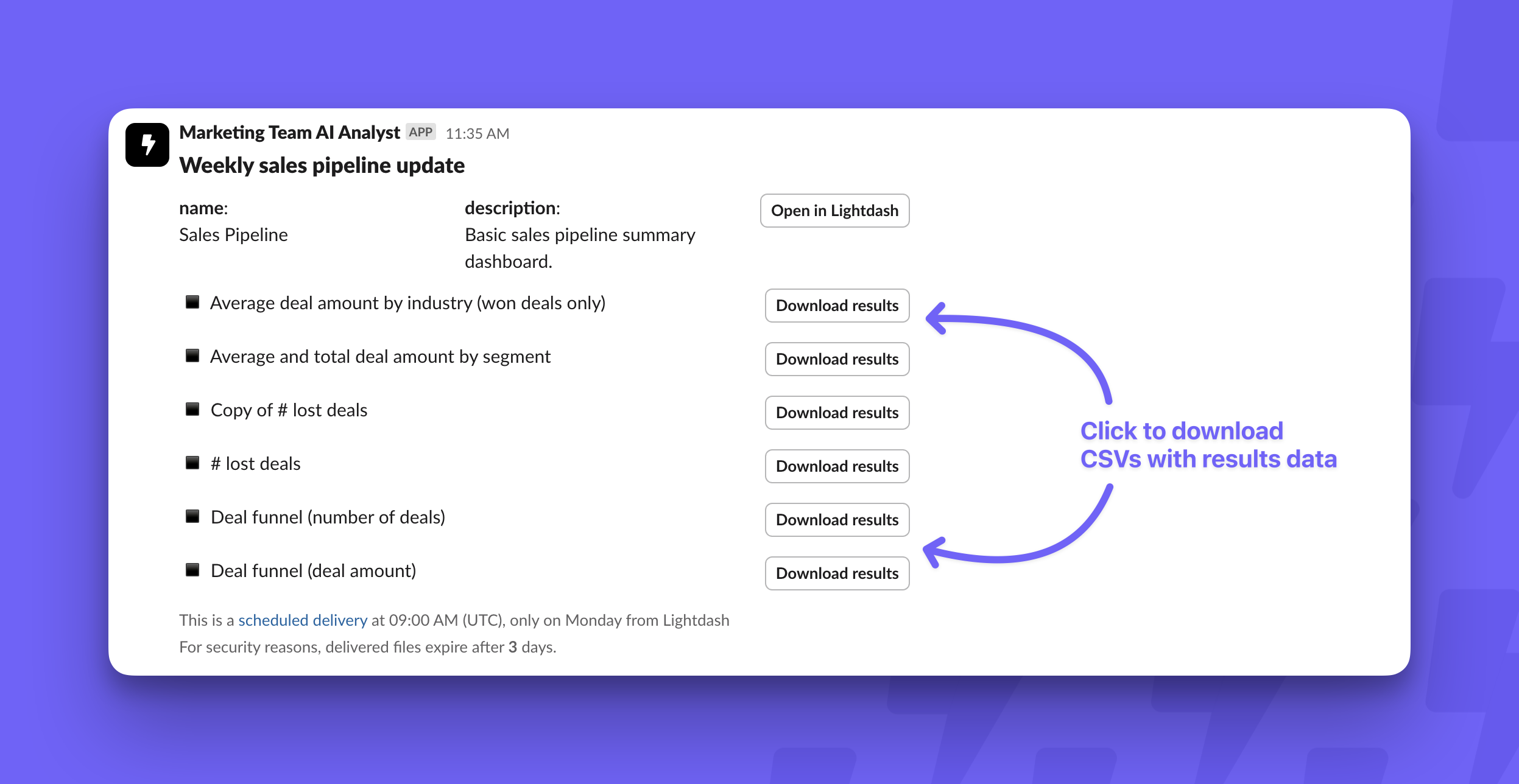 In addition to scheduled deliveries, you can also set up alerts on saved charts that only send to slack if certain criteria are met.