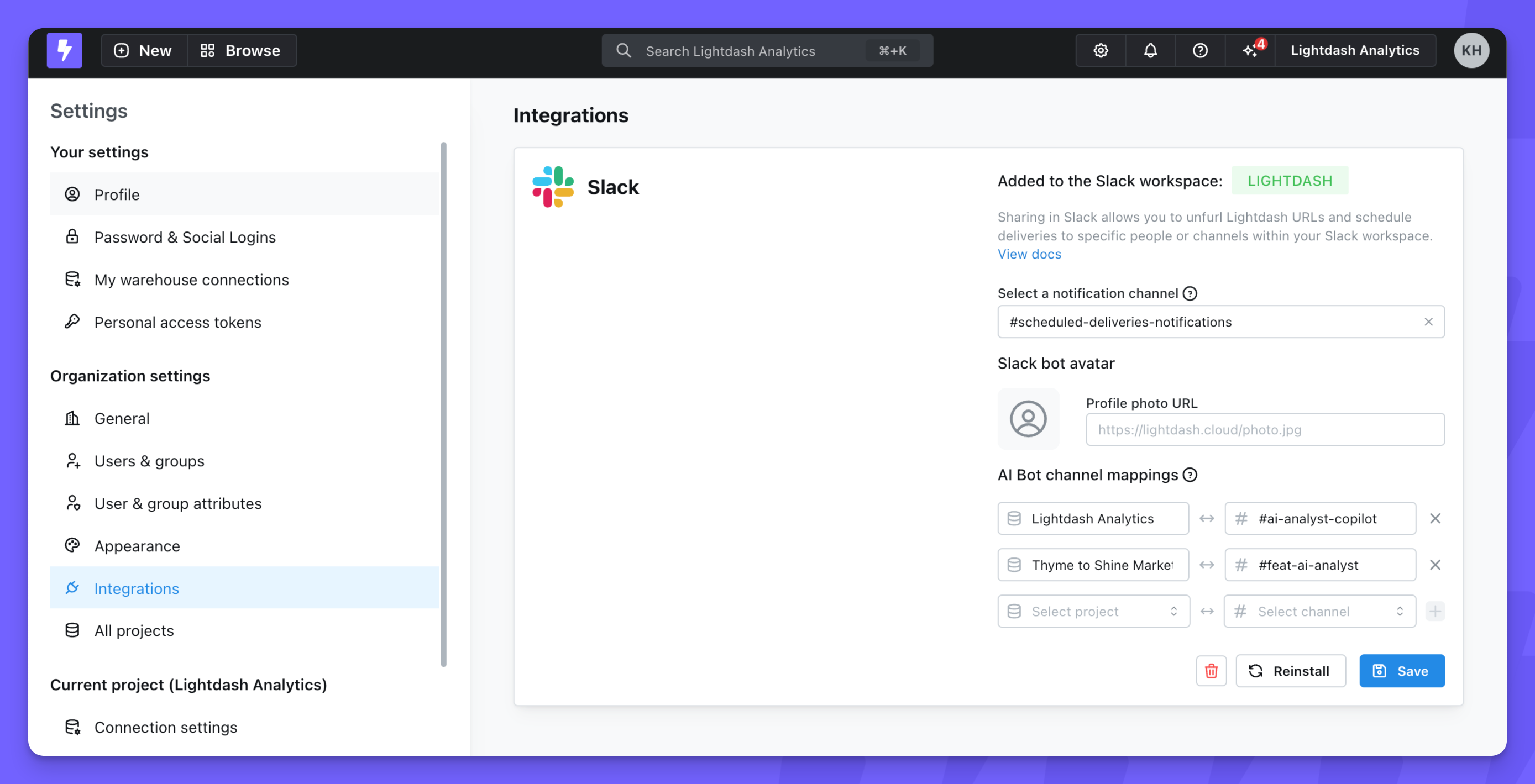 Here you can choose which project is used by the Lightdash AI analyst co-pilot for each of your Slack channels. Only one project can be used for each channel.Unfurl Lightdash links