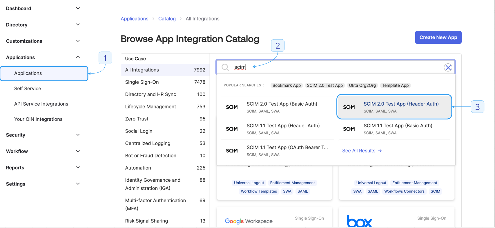 - Search for “SCIM” and select SCIM 2.0 Test App (Header Auth).